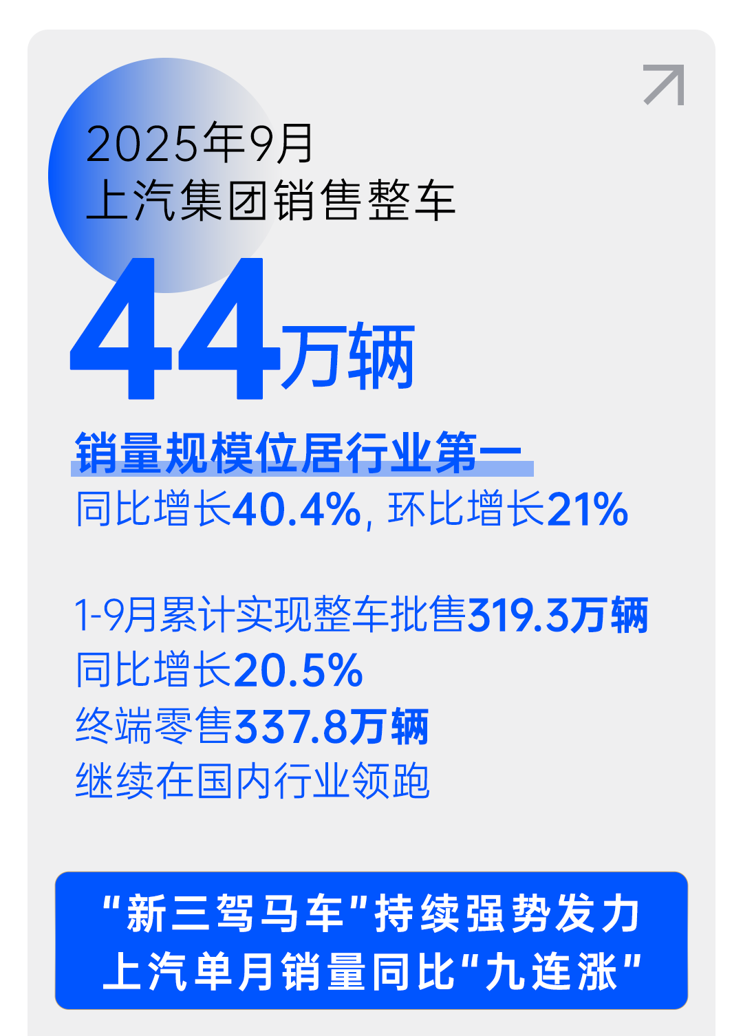 整车销售44万辆,同比增长40.4%,环比增长21%,行业第一,创下年内新高。这是刚刚过去的9月,上汽集团创下的销量业绩。这一业绩,再次显示出上汽集团全面深化改革后爆发的无穷活力。