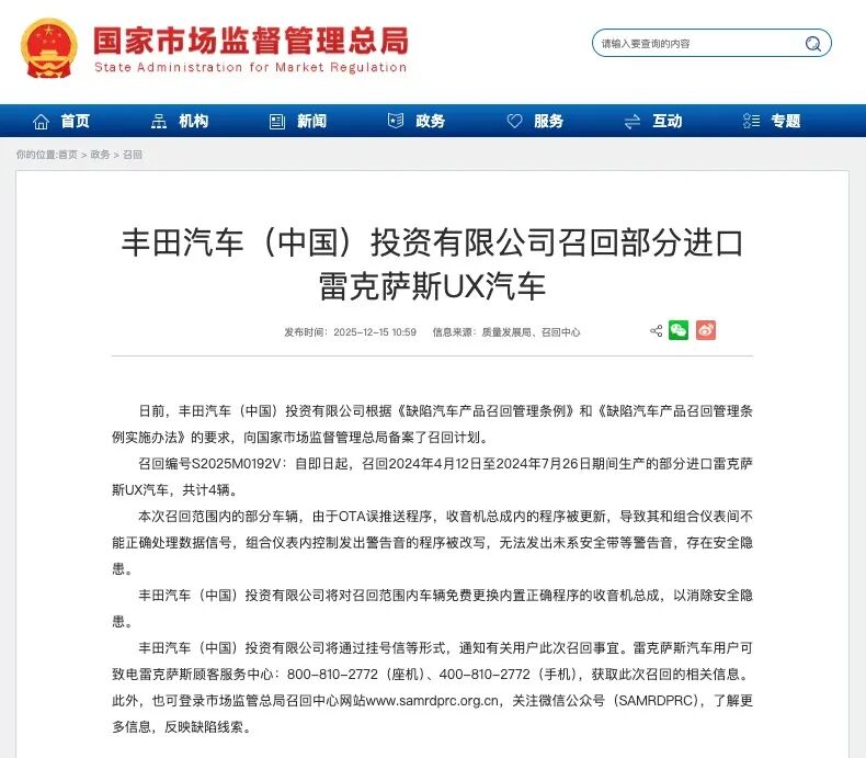 12月15日,国家市场监管总局披露,日前,丰田汽车(中国)投资有限公司根据《缺陷汽车产品召回管理条例》和《缺陷汽车产品召回管理条例实施办法》的要求,向国家市场监督管理总局备案了召回计划。