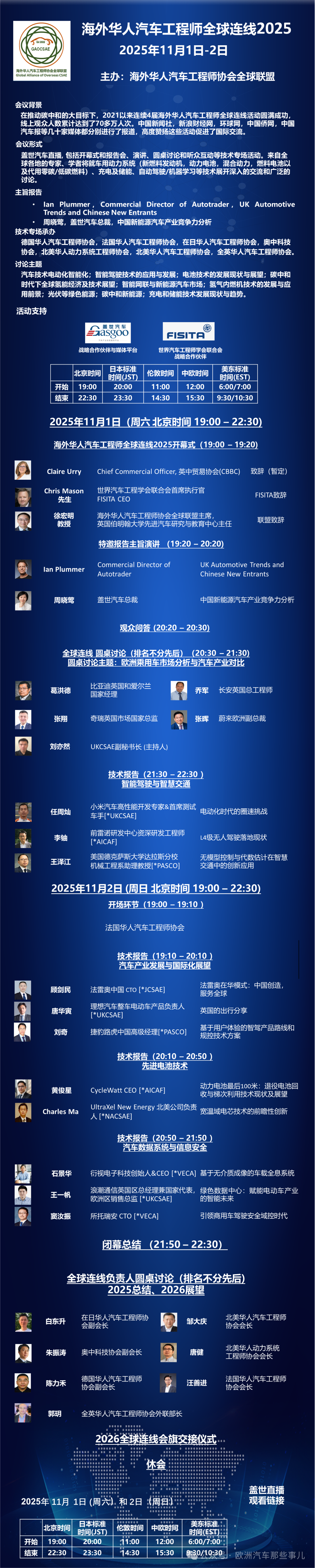 海外华人汽车工程师全球连线2025线上论坛活动将于2025年11月1日(周六)和11月2日(周日)举行。