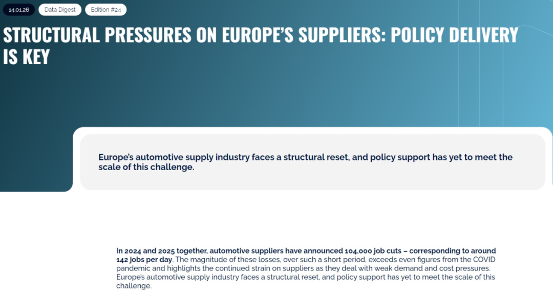 “我们必须立即止损:汽车供应链中已有超过10万人失业或即将失业——这意味着每天都有140个家庭受到影响。《汽车产业一揽子计划》如今必须发挥实效,通过恢复公平竞争、降低运营成本、赋予企业真正的监管灵活性,保障民生就业,留住欧洲的工程技术人才。”克里格表示。