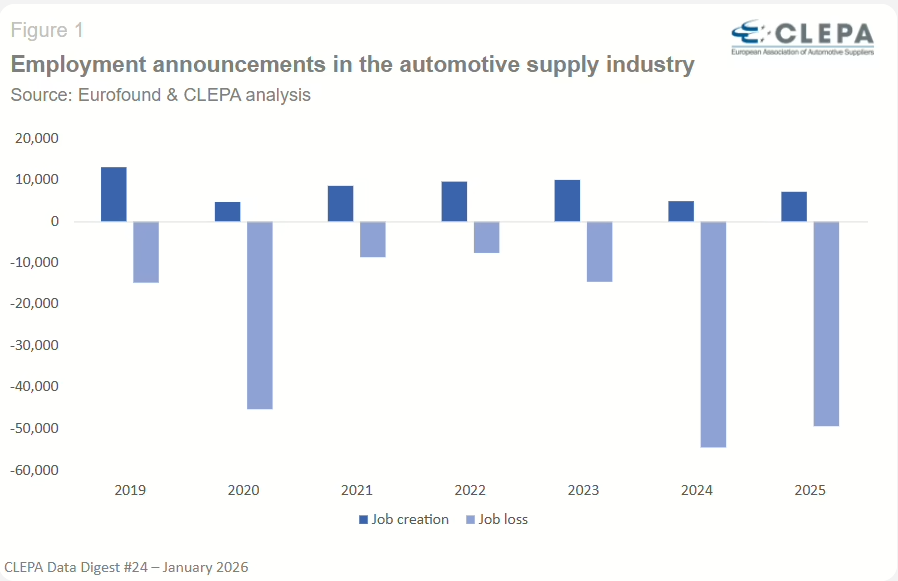 更令人担忧的是,就业市场的“失血”态势难以逆转。CLEPA指出,2025年欧洲汽车零部件行业仅宣布新增7000个工作职位,与高达5万人的裁员规模形成鲜明反差。