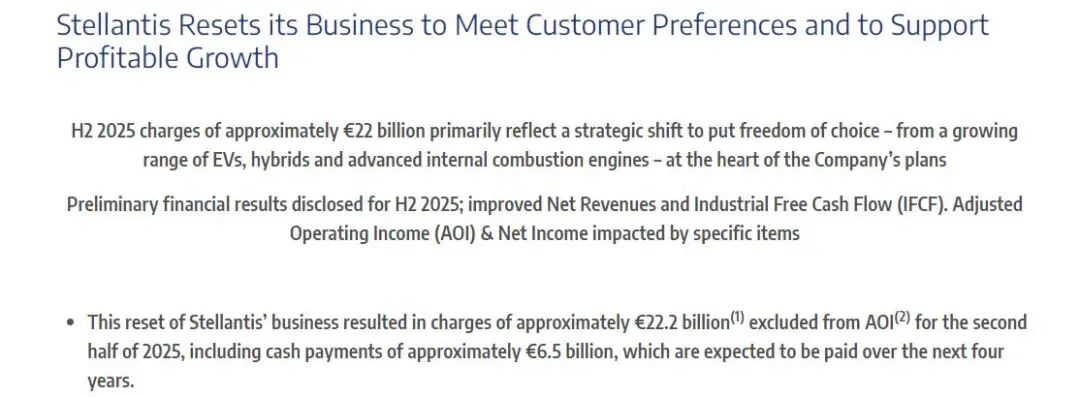 在财务表现方面,业务重组将对集团业绩产生较大冲击。Stellantis预计,受此项计提影响,2025年下半年将录得190亿至210亿欧元的净亏损,公司为此决定暂停发放2026年度的股东股息。毕竟,虽然这笔总计222亿欧元的费用中包含了大量的非现金减值,但未来四年内仍将产生约65亿欧元的现金支出。